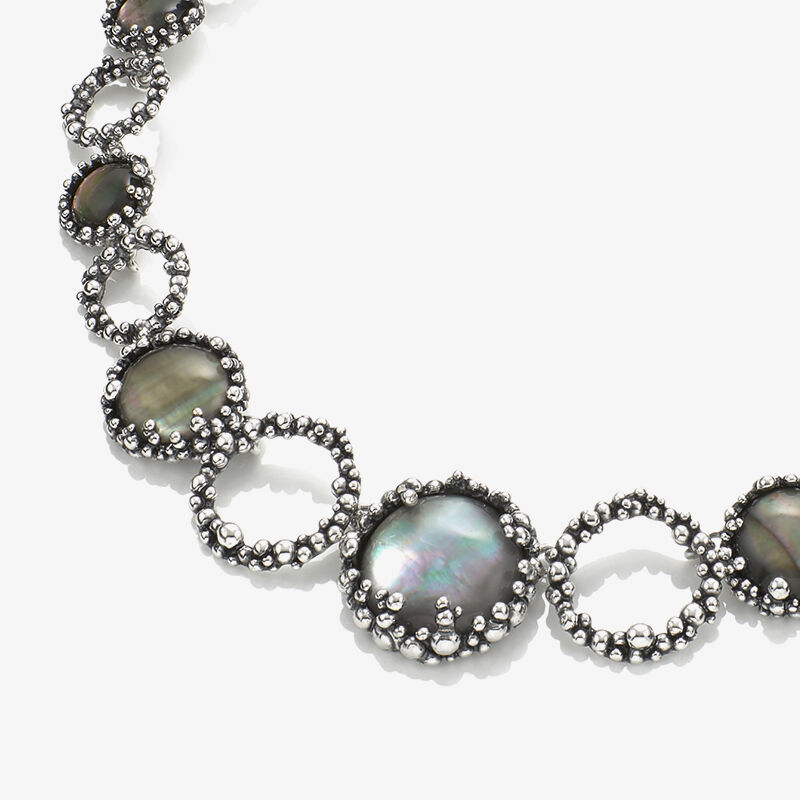 Small burnished silver elements, alternating with luminous spherules of angelite, make this bracelet a small masterpiece of contemporary elegance. Entirely handcrafted in our workshop.