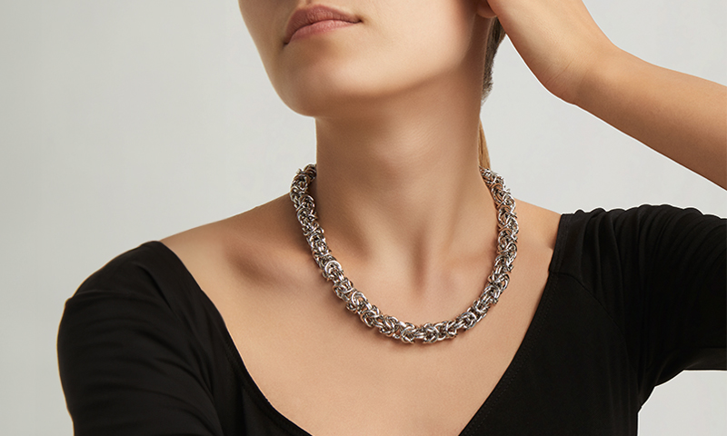 Giovanni Raspini presents a timeless classic, revisiting it in a contemporary key. The silver Byzantine chain jewellery expresses all the volumetric elegance and precious luminosity achieved by the craftsmanship.