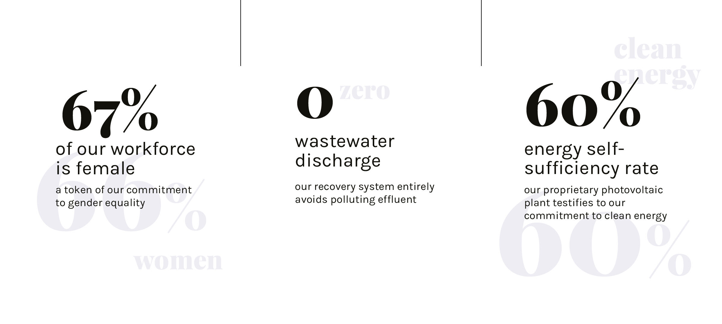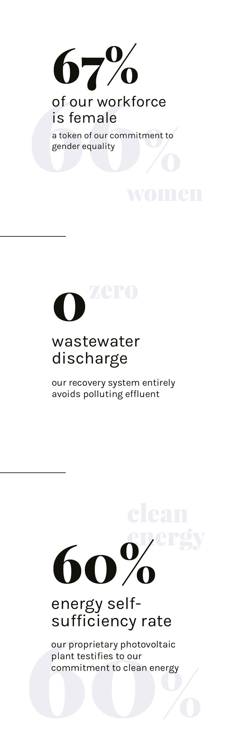 For some time now, our focus has been on an even more ambitious goal: on the one hand, to further improve our environmental impact and care for the local area, and on the other, to anchor our growth to a mindset predicated on professional respect, reliability and total compliance. Moreover, our goals include even more sustainable working conditions and an enhancement of human capital, with improved social impact and inclusion initiatives to benefit our employees.